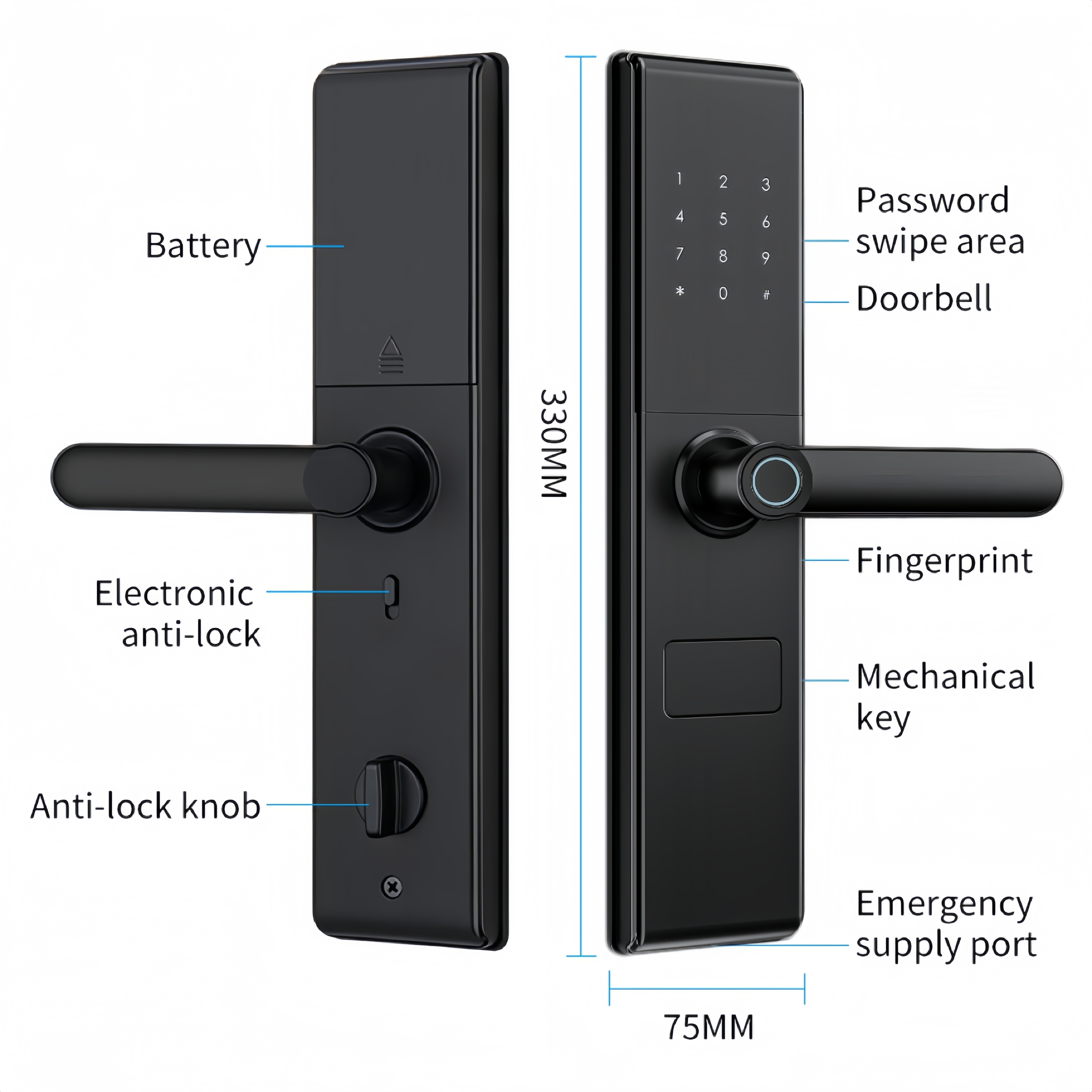 * Nhiều tùy chọn mở khóa ️ Hỗ trợ vân tay, mật khẩu, thẻ khóa, khóa cơ học và điều khiển từ xa Tuya App.