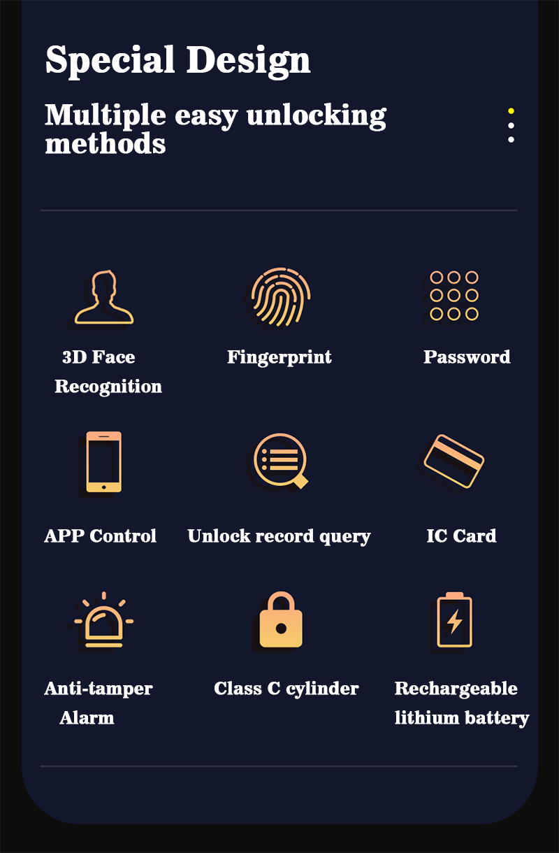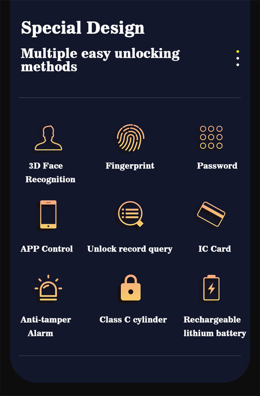 | Phương pháp mở khóa | Ứng dụng WiFi Tuya, mật khẩu, dấu vân tay, thẻ, chìa khóa |